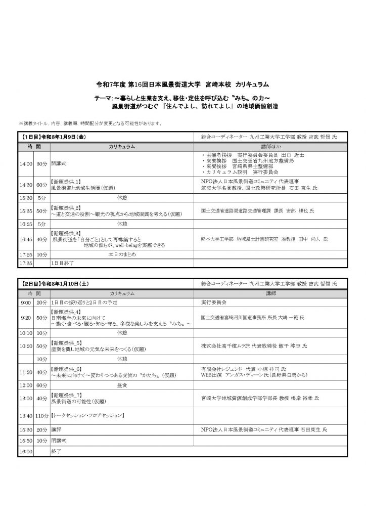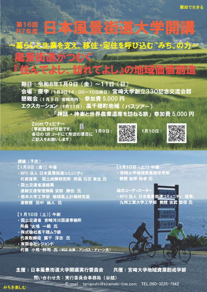 R7年度 第16回日本風景街道大学 開講案内 R7年度 第16回日本風景街道大学 の募集を開始いたしました。 ダウンロード ・チラシ(PDF) ・カリキュラム(PDF) ・エクスカーション行程(PDF) ・現地参加用 申込用紙(エクセル) ※オンライン参加ご希望の方は、zoomウェビナーへの登録をお願いいたします。 1日目 オンラインzoomウェビナー登録 2日目 オンラインzoomウェビナー登録